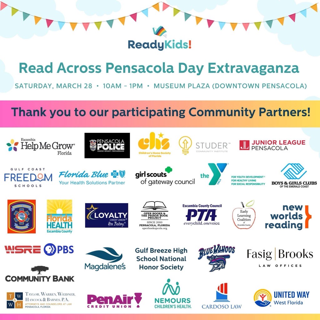 Families are invited to Read Across Pensacola Day Extravaganza on Saturday, March 28, 2026, from 10:00 AM – 1:00 PM at Museum Plaza in the heart of downtown Pensacola (300 S Tarragona St, Pensacola, FL 32502).